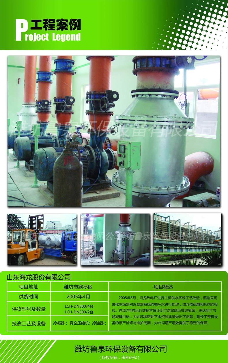 2005年5月,海龍熱電廠進行主機供水系統工藝改造,甄選采用磁化除垢器對冷凝器系統的循環水進行處理,放棄濃硫酸和藥劑的投放。連續7年的運行數據不僅證明了防腐除垢目的實現,更達到了節能減排目標,為北部城區地下水資源質量做出了貢獻,延長了整機設備的停產檢修與維護,讓公司增產增效提供了穩定的保障。