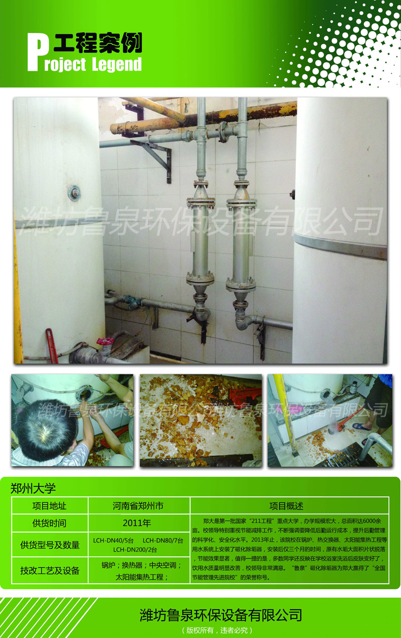 鄭大是批國家“211工程”重點大學,辦學規模宏大,總面積達6000余畝。別榮海副校長特別重視節能減排工作,不斷強調要降低后勤運行成本,提升后勤管理的科學化、安全化水平。2012年末,該院校在鍋爐、熱交換器、太陽能集熱工程等用水系統上安裝了磁化除垢器,安裝后僅三個月的時間,原有水垢大面積片狀脫落,節能效果顯著,值得一提的是,多數同學還反映在學校浴室洗澡后皮膚變好了,飲用水質量明顯提高。校領導非常滿意,“魯泉”磁化除垢器為鄭大贏得了“全國節能管理先進院校”的榮譽稱號。