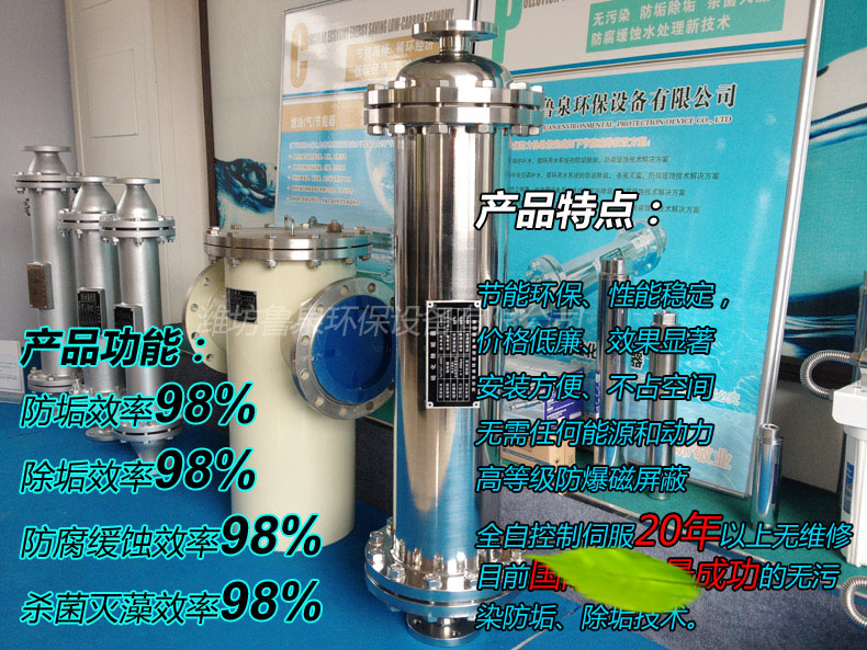 產品特點:節能環保、性能穩定,價格低廉、效果顯著,安裝方便、不占空間,無需任何能源和動力、高等級防爆磁屏蔽,全自控制伺服20年以上無維修,目前國際國內最成功的無污染防垢、除垢技術。