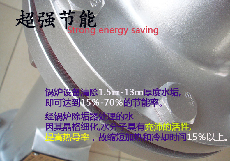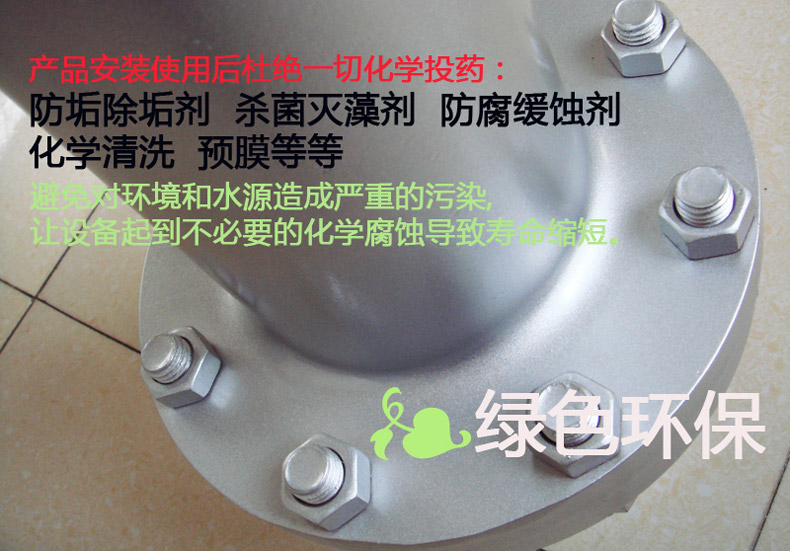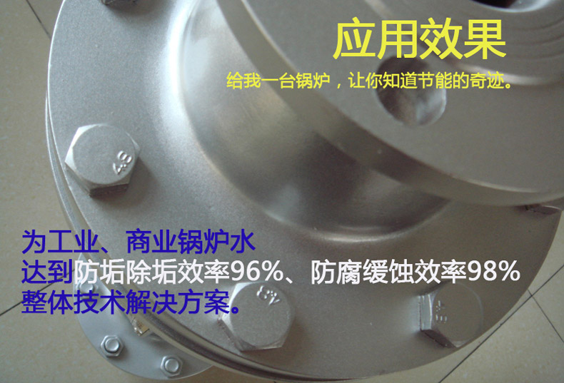 水分子有較強的極性,水或溶液以一定的速度垂直磁力線流經強磁場時,使水分子破碎為單個或較小的締合水分子,使水發生了物理變化,并改變了原子或分子結構,其電導率、溶解度、滲透壓、溶解氧、表面張力和PH值均有所變化,電荷積聚在鍋爐和管壁上,與磁化后的水及溶液中的離子電極性相互吸引,在鍋爐或管壁上形成一層荷電性相反的保護膜,保證了設備內壁不受腐蝕,磁化水在蒸煮過程中,使鈣和鎂離子生成疏松的CaCO3和MgCO3,瞬間結成顆粒狀的晶體,像沙子或雪花片一樣被水流沖刷并帶到排污口排除。同理,對原來水垢而言,其礦物鹽結晶的分子間維系亦告削弱,因而能慢慢溶解、逐漸龜裂、疏松軟化、自行脫落下來,并隨爐水的定期排污而排出。并且具有殺菌滅藻的獨特功能。