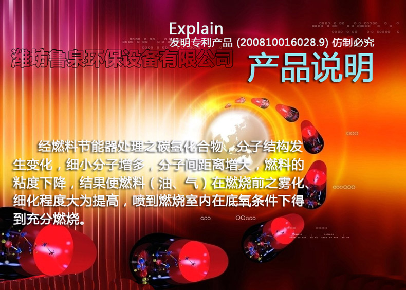 經燃料節能器處理之碳氫化合物,分子結構發生變化,細小分子增多,分子間距離增大,燃料的粘度下降,結果使燃料(油、氣)在燃燒前之霧化、細化程度大為提 高,噴到燃燒室內在底氧條件下得到充分燃燒,因而燃燒設備之鼓風量可以減少百分之15至百分之20,避免煙道中帶走之熱量,煙道溫度下降百分之30左右。 節省了燃料,保護了廢氣對環境的污染。