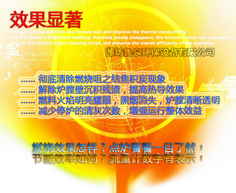 3. 解除因燃料得不到充分燃燒而爐膛壁積殘渣現象,提高傳熱效果,改善熱導率。達到環保節能效果。