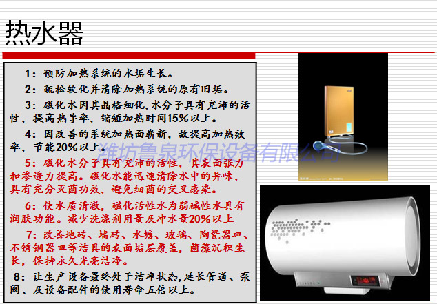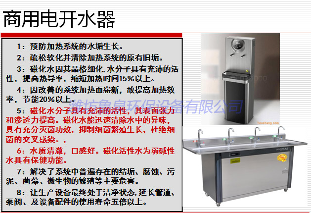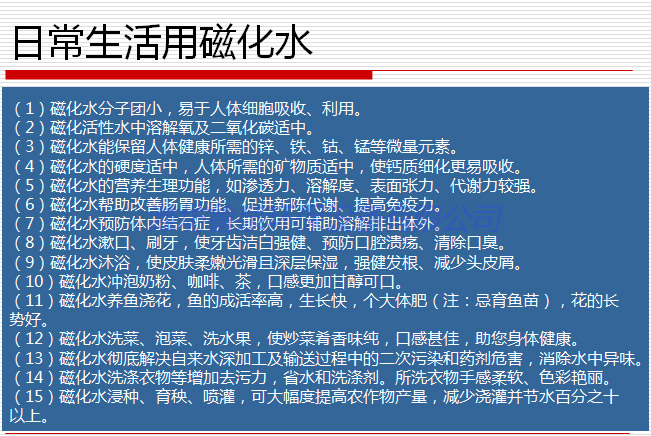 (13)磁化水徹底解決自來(lái)水深加工及輸送過(guò)程中的二次污染和藥劑危害,消除水中異味。