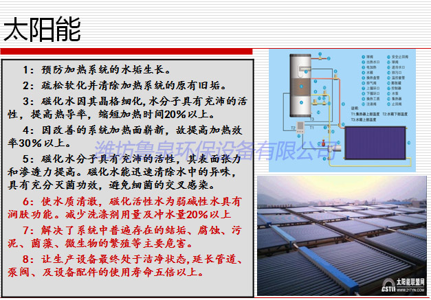 磁化水器必須安裝在水表出口處或水龍頭之前,每戶(hù)只需一臺(tái),全家享用磁化水。電加熱器、太陽(yáng)能安裝在進(jìn)水管便可,如果準(zhǔn)對(duì)家用電器防垢除垢,磁化水即出即加熱,不易久放。(例:太陽(yáng)能最好早晨補(bǔ)水),對(duì)于全自動(dòng)補(bǔ)水加熱電器不受限制。家用電器如果舊水垢十日后開(kāi)始脫落,需連續(xù)幾次加強(qiáng)排水,把脫落水垢排除干凈為止。以后安實(shí)決定。
