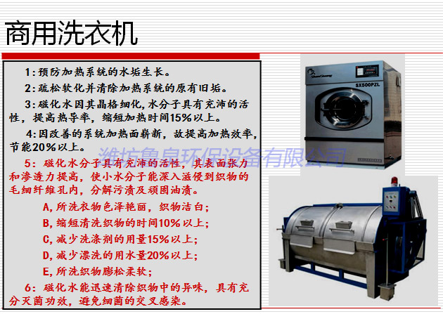 (14)磁化水洗滌衣物等增加去污力,省水和洗滌劑。所洗衣物手感柔軟、色彩艷麗。